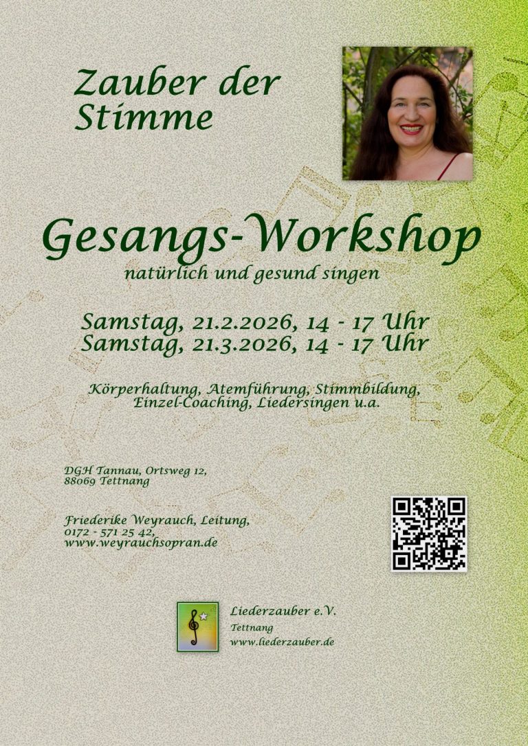 Details zu den Gesangs-Workshops finden Sie auf der Webseite der Kursleiterin Friederike Weyrauch www.weyrauchsopran.de